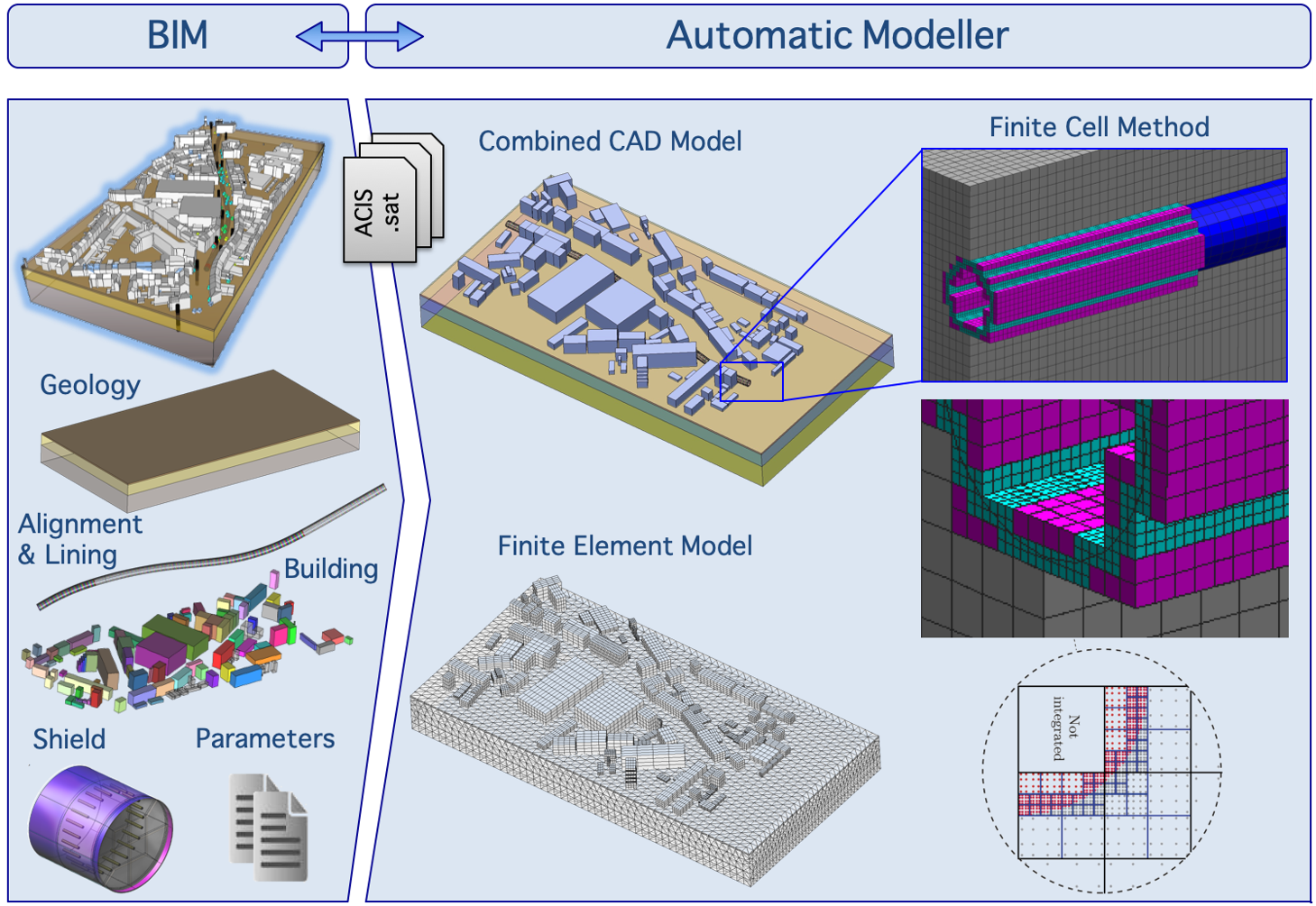 The Research Group on „Computational Modeling in Tunneling and Underground Structures” is concerned with the developments of computational simulation models and numerical techniques for analyzing complex underground structures and processes, in particular in mechanized tunneling. One of the main focuses of this research group is the holistic process oriented numerical modeling of the mechanized tunneling process (ekate). Several advanced numerical methods, e.g. FEM, PFEM, Immersed Boundary (IB) method, Finite Cell Method and Peridynamics, are employed to model the involved physical phenomena in each individual process. With the move toward digitalization and high performance computing, this research group is also concerned with the integration of parallelization strategies and Building Information Modeling (BIM) within the numerical simulations.On the other hand, several computer-aided engineering decision-support strategies have been developed to enable real-time decision-making in subsurface engineering. These strategies incorporate state-of-the-art machine learning techniques, including physics-informed neural networks (PINN) and deep neural operators (DeepONet).