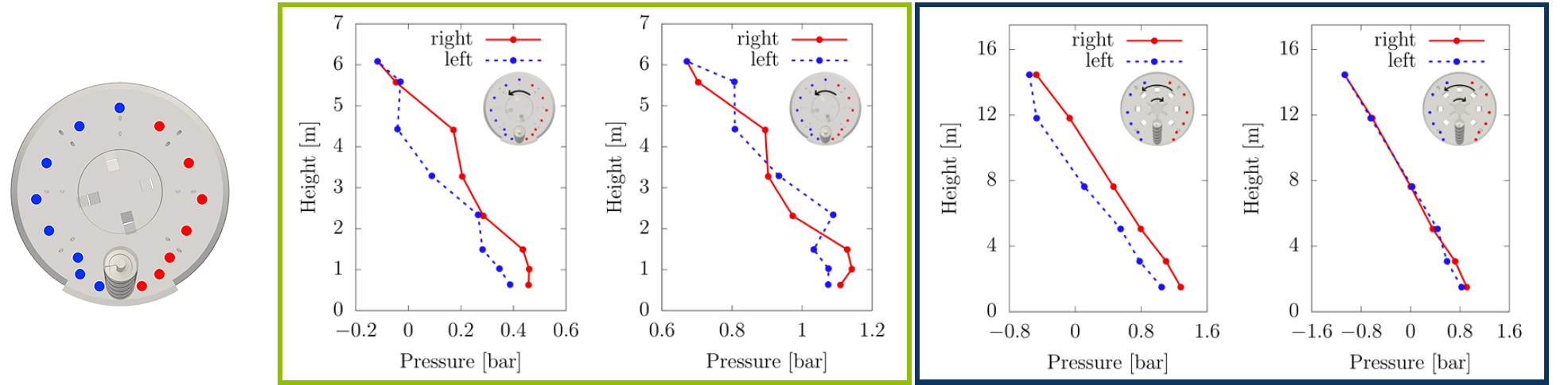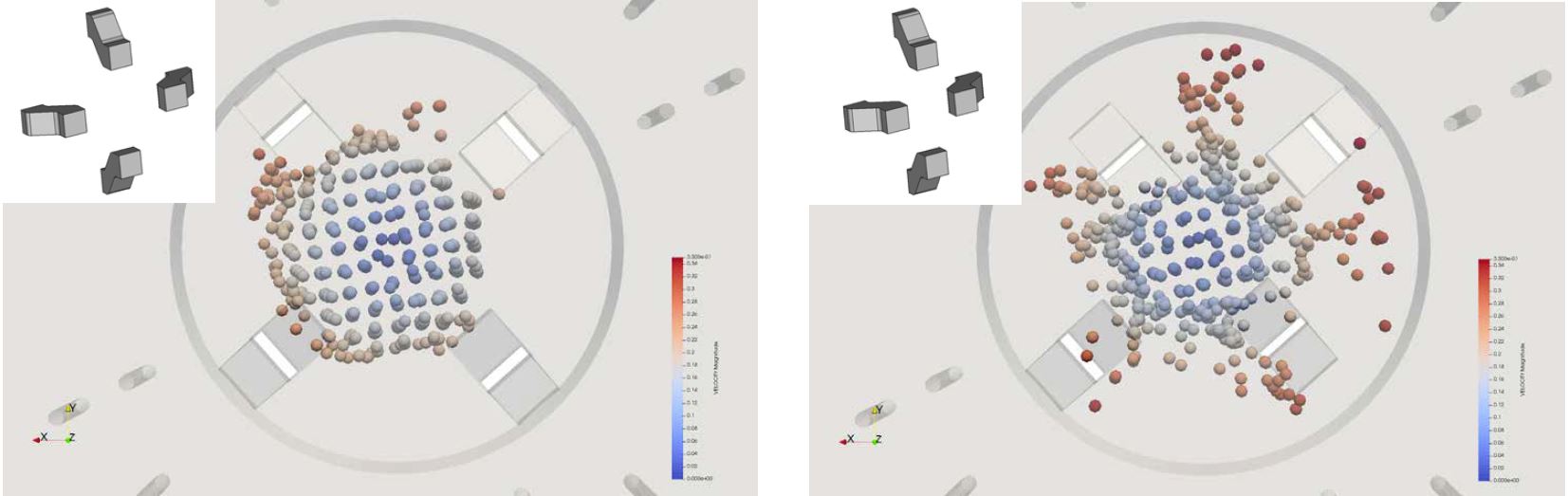 The efficiency of material transport in the center zone of the chamber was studied by considering different configurations of the cutterhead rotators, as shown in Fig. 3. It was shown, that a non-symmetric arrangement of the rotators leads to a significantly improved performance in terms of expelling the material out of the center zone towards the screw conveyor [4]. In contrast, for the symmetric configuration, the material stays longer in the center zone of the chamber, which increases the risk of clogging and degradation of material properties.