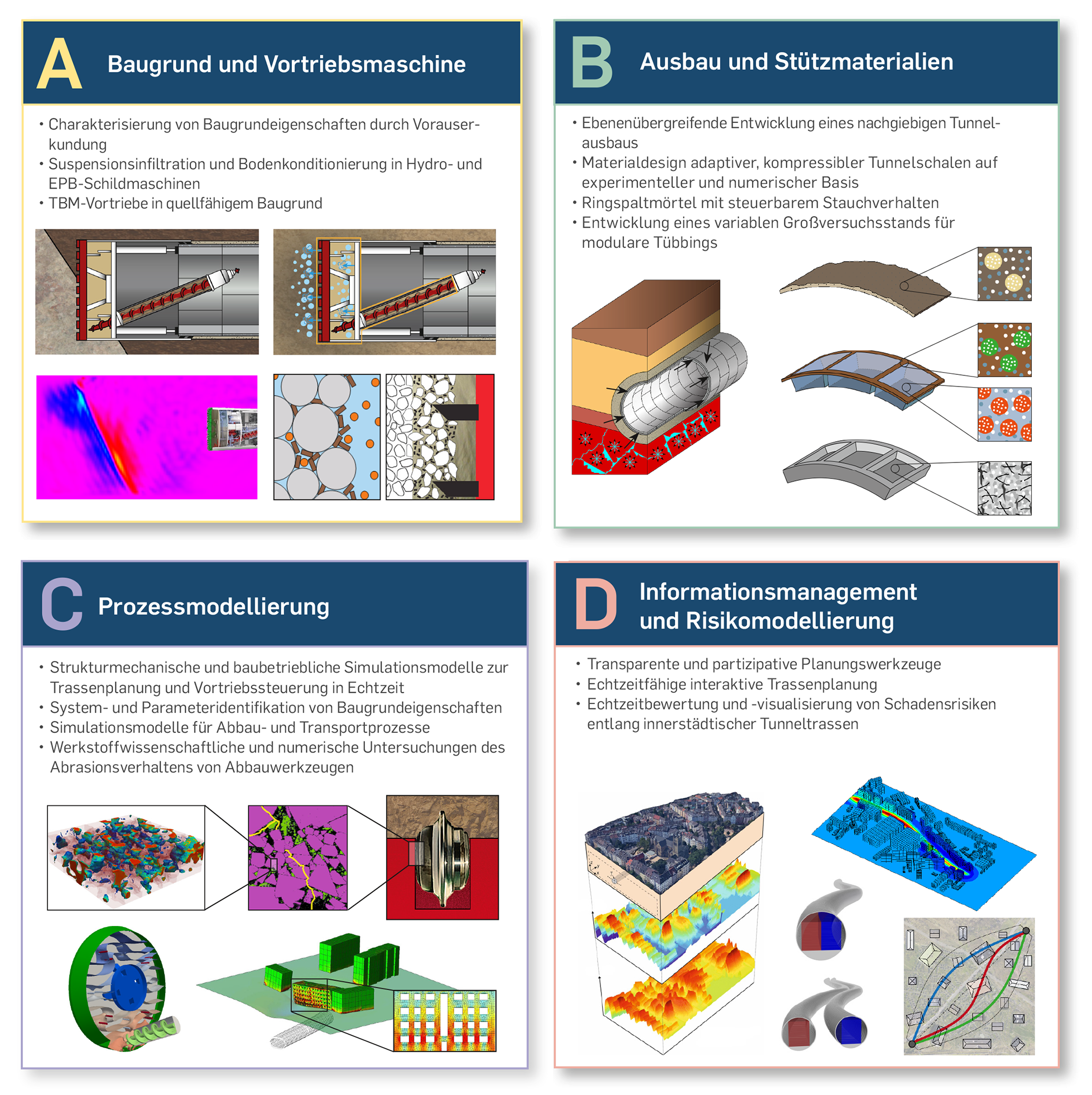 Vor dem Hintergrund einer stetigen Ausweitung des Einsatzbereichs dieser Technik, der Tendenz zu größeren Durchmessern und steigenden Anforderungen an die Eingrenzung vortriebsbedingter Risiken widmen sich im SFB 837 Wissenschaftlerinnen und Wissenschaftler aus den Bereichen Bauingenieurwesen, Computational Engineering, Geowissenschaften und dem Maschinenbau der Erforschung aller wesentlichen, die Sicherheit und Effizienz des maschinellen Tunnelbaus betreffenden Prozesse und deren Wechselwirkungen. Durch eine Synthese von computerorientierter Modellierung, experimenteller Forschung und digitalen Planungsmethoden ist es bereits in den ersten beiden Forschungsperioden gelungen, bislang vereinfacht empirisch erfasste Sachverhalte wissenschaftlich fundiert zu beschreiben und dadurch Potentiale für die Optimierung von Projektplanung- und Ausführung bzw. der gesamten Verfahrenstechnik im maschinellen Tunnelbau aufzuzeigen.