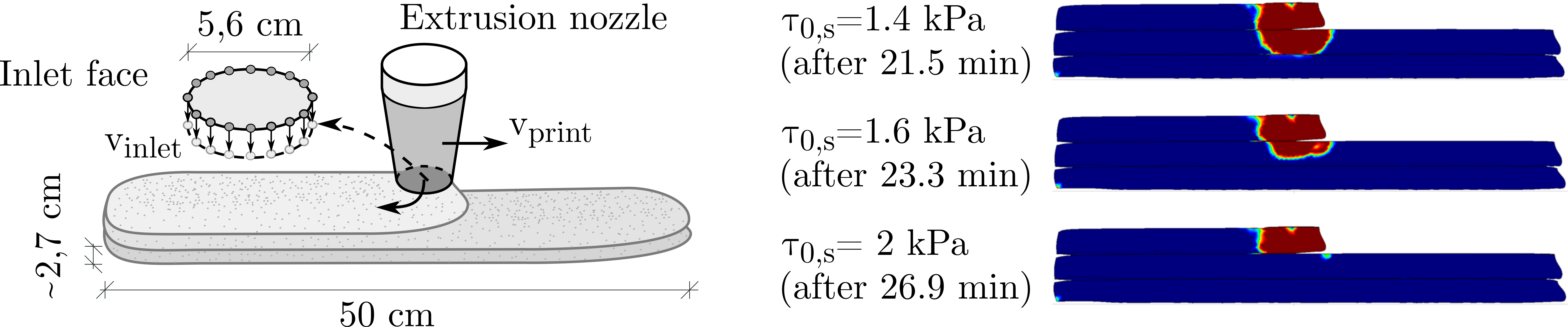 The structural response and shape stability properties of the material during the 3D-concrete-printing process are assessed in this analysis. Therefore, a numerical study of three printed layers is performed, see Fig. 1 left. In Fig. 1 right the time instance, when the third layer is printed is given along with the yielded (red) and unyielded (blue) regions. The results are given for three different static yield stresses (or waiting times between each layer). As can be seen, for the lowest static yield stress (or youngest material age) lower layers are plastically deformed from the pressure of the inlet flow and unwanted deformations of lower layers occur. If the waiting time is long enough, lower layers gained enough strength to bear the impact load from the inlet flow (see Fig. 1 right).