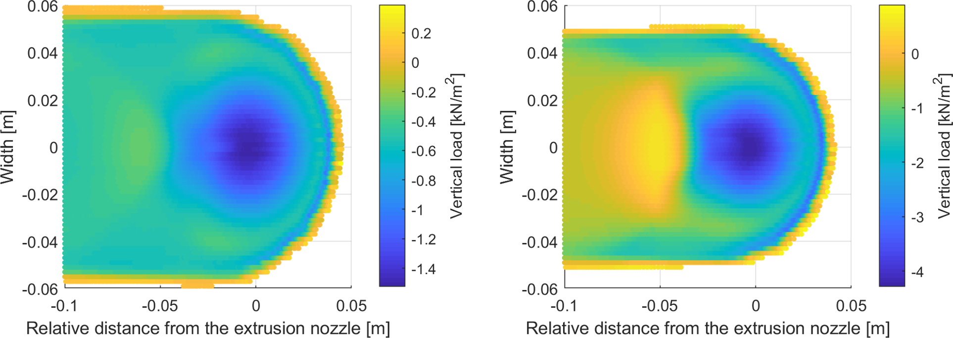 It can be observed that the vertical loads from the inlet flow on lower layers are very sensitive to the material parameters (or the age or state of structuration) of the extruded material. In Fig. 2 the results of the time averaged vertical reaction forces under the extrusion nozzle are given for two materials with different dynamic yield stresses. For both materials the peak value of the vertical load is reached directly under the extrusion nozzle.