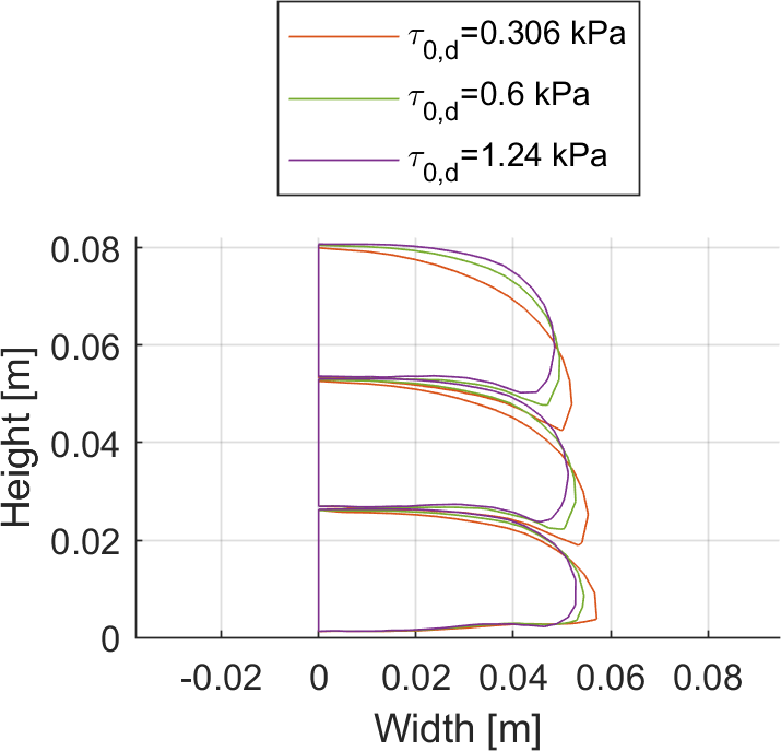 The actual shape and cross-section of the printed layers are given in Fig. 3 for different materials. As can be seen, better shape stability properties are gained for materials with larger dynamic yield stresses. Nevertheless, even though the shape varies for different material parameters, the final height of the printed filaments is the same, when lower layers have a static yield stress large enough to carry all relevant loads.